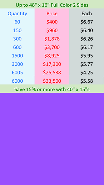 We show only the most efficient sizes for 48x96" and 60x120" master sheets. Any size is available. We also show number of signs at a price break number of full sheets (10 full sheets, 25 full sheets, 50 full sheets, ...).